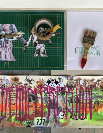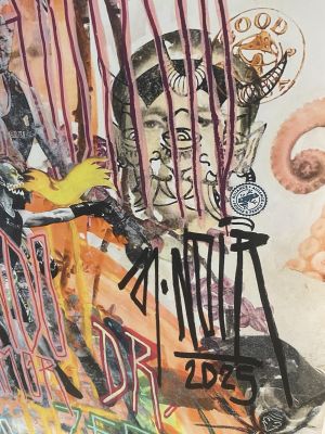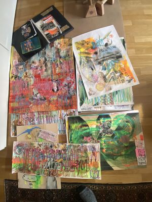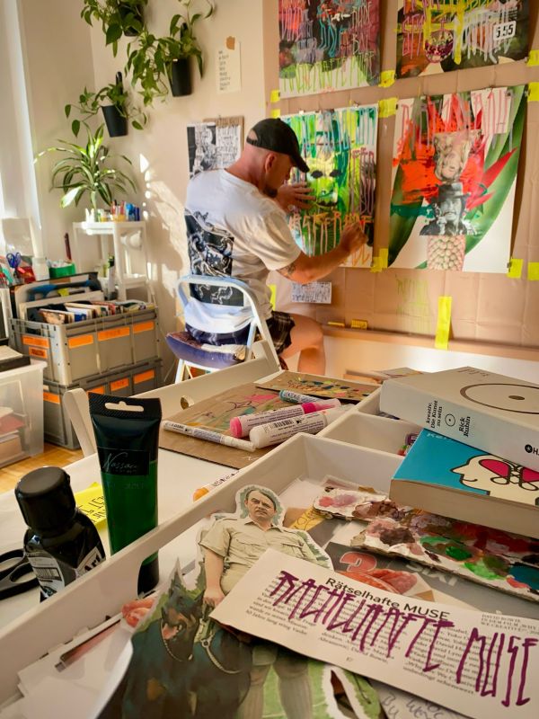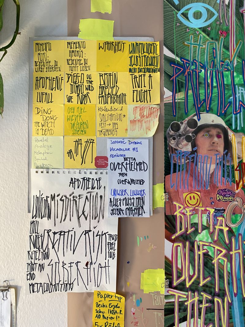 I don’t plan tidy series in advance. I work intuitively, following what feels psychologically true rather than what seems marketable. Years of teaching art have shown me how much fear and perfectionism cut people off from their own expression. In my studio I actively push against these reflexes. Mistakes and fractions stay in the images; text is allowed to be loud. The result is art that may look chaotic at first glance, but on a second look reveals patterns, connections and a surprising amount of clarity.